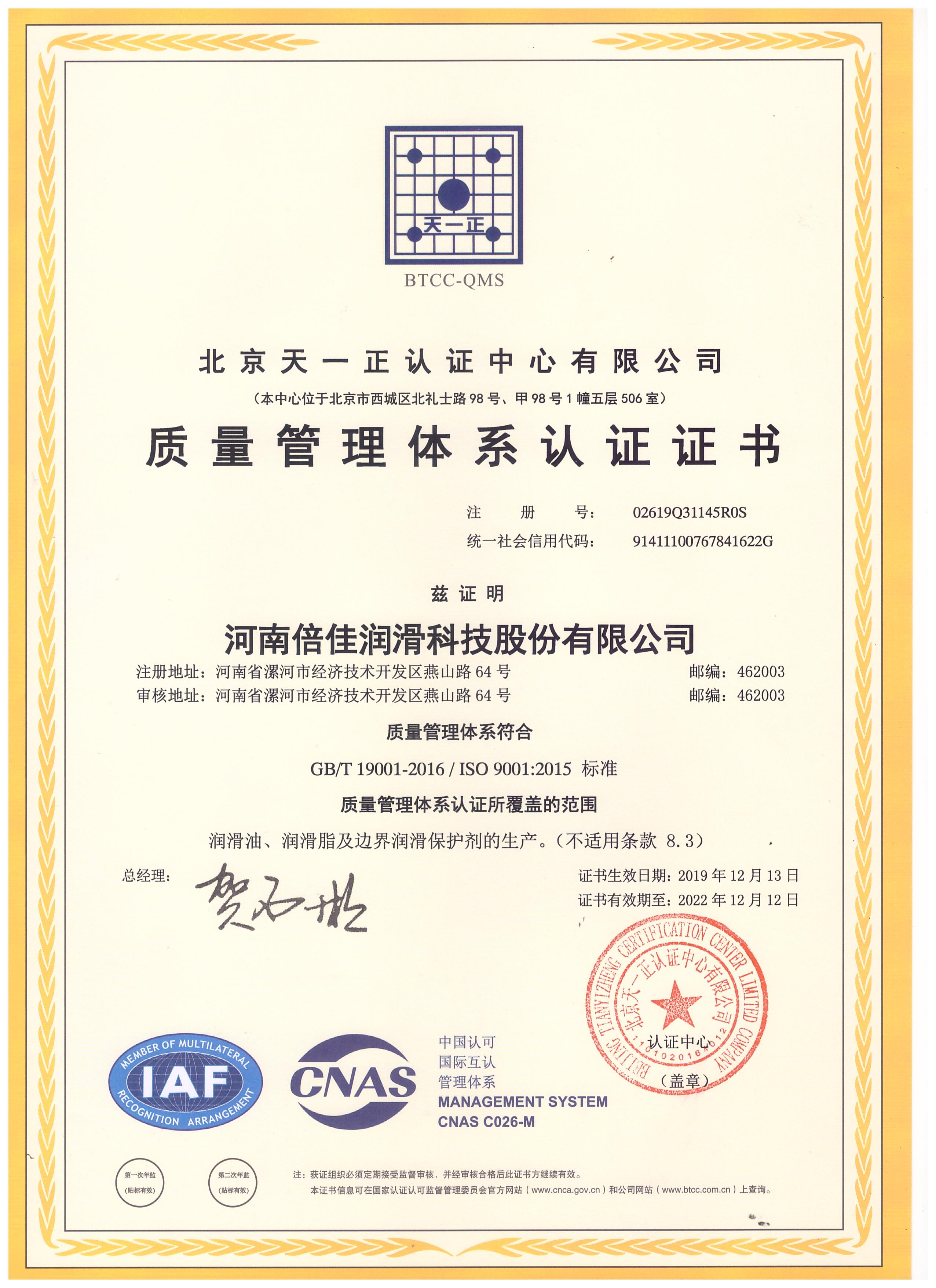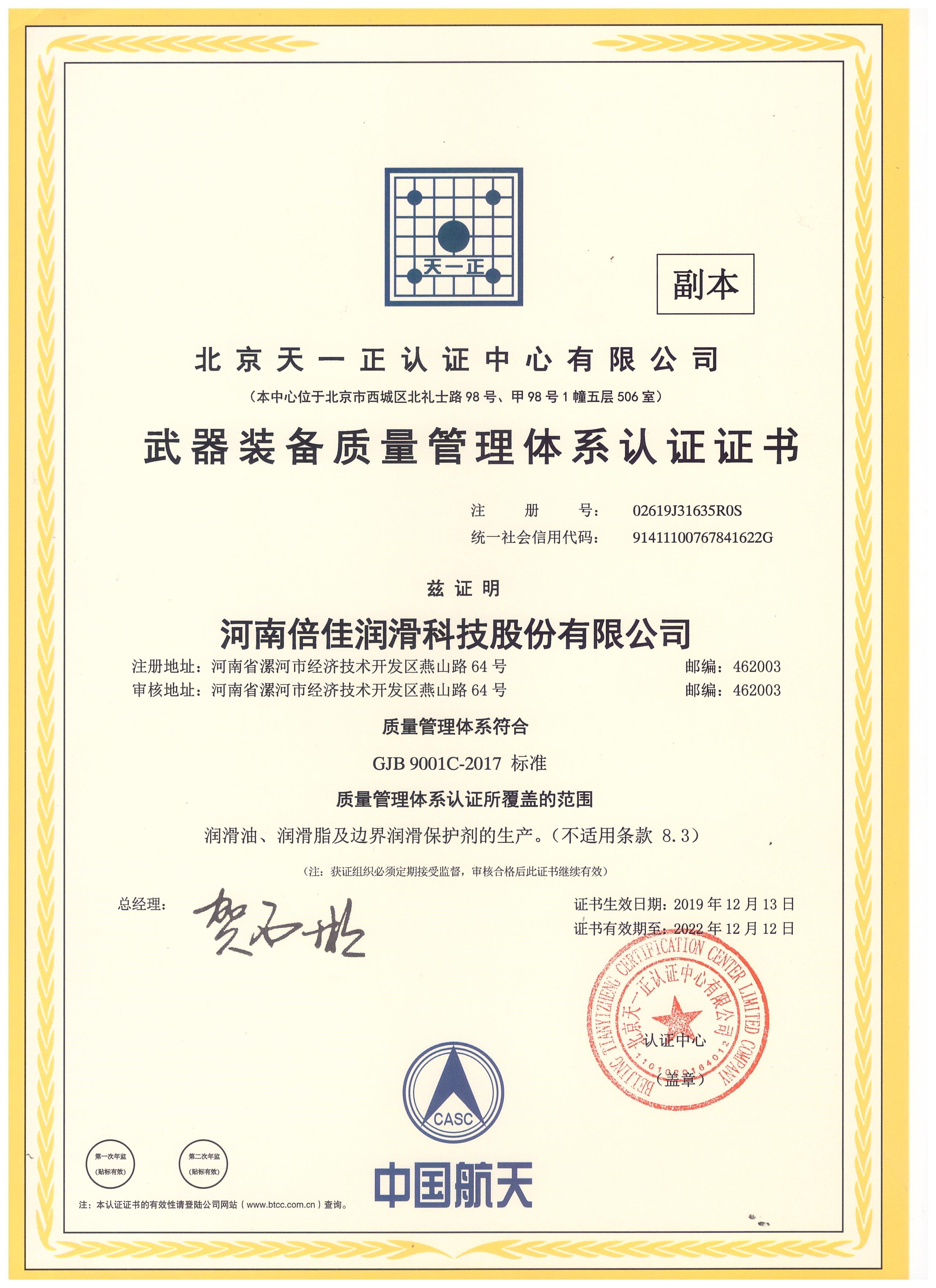 12月13日,河南倍佳润滑科技股份有限公司获得由北京天一正认证中心有限公司颁发的《GJB9001C-2017武器装备质量管理体系认证证书》和《GB/T19001-2016/ISO